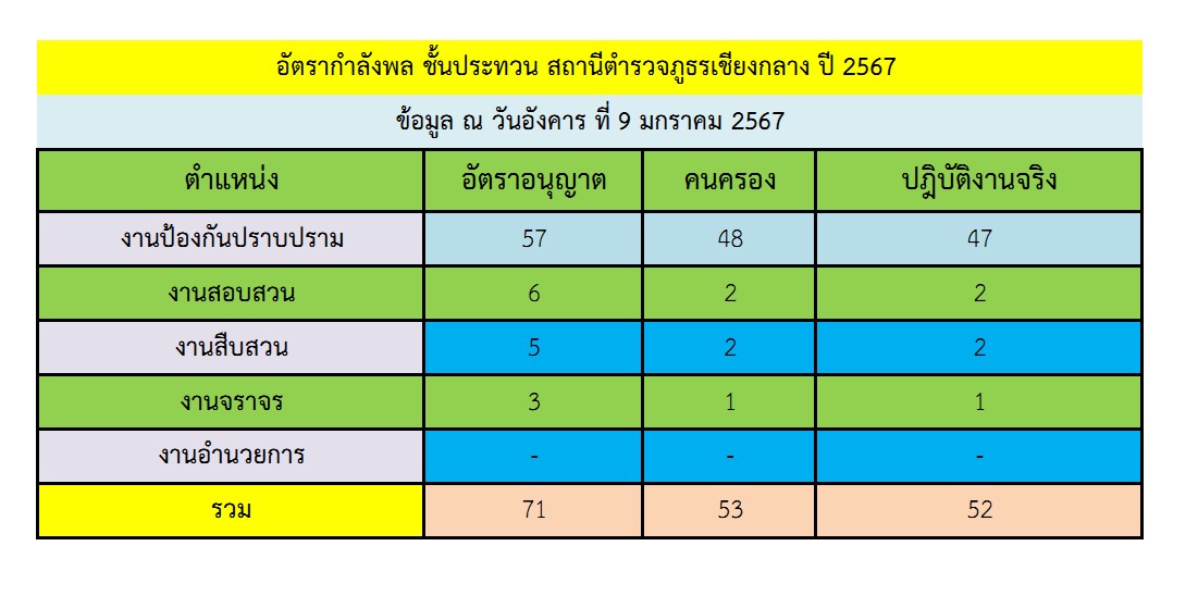 01.โครงสร้างหน่วยงาน อัตรากำลัง และข้อมูลผูับริหาร 28 พฤษภาคม 2023 โดย admin / ผู้บริหารสถานีตำรวจภูธรเชียงกลาง ผกก.สภ.เชียงกลาง พ.ต.อ.สุทธิพงศ์ จงวัฒนา ผู้กำกับการสถานีตำรวจภูธรเชียงกลาง เบอร์โทรศัพท์ 085-6940052 ระดับ รอง ผกก.สภ.เชียงกลาง พ.ต.ท.สุวิวัฒณ์ สัญญา รอง ผกก.ป.สภ.เชียงกลางเบอร์โทรศัพท์ 081 855 8604 พ.ต.ท.สมาน ปันชุนรอง ผกก.(สอบสวน)สภ.เชียงกลางเบอร์โทรศัพท์ 091-8240314 พ.ต.ท.สหภพ อินใจคำ รองผกก.สส.สภ.เชียงกลางเบอร์โทรศัพท์ 090-8931093 ระดับ สว.สภ.เชียงกลาง พ.ต.ท.ประชา คงคารักษ์สวป.สภ.เชียงกลางเบอร์โทรศัพท์ 094-6519329 พ.ต.ต.ธนดล อินทรประดิษฐ์สว.สส.สภ.เชียงกลางเบอร์โทรศัพท์ 091-3066978 พ.ต.ต.จรัส ธัญญะสว.ธร.สภ.เชียงกลางเบอร์โทรศัพท์ 086-5655468