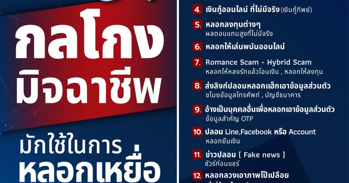 เตือนภัยมิจฉาชีพ รวม 14 รูปแบบ กลโกงหลอกเหยื่อทางออนไลน์ รู้ไว้ ! เพื่อเป็นข้อมูลศึกษาวิธีป้องกันตัว เช่น กู้เงินออนไลน์ ,แก๊งคอลเซ็นเตอร์ ,ชวนไปทำงานต่างประเทศ ,ปลอมบัญชีไลน์ และ หลอกให้เล่นพนันออนไลน์ เป็นต้น
