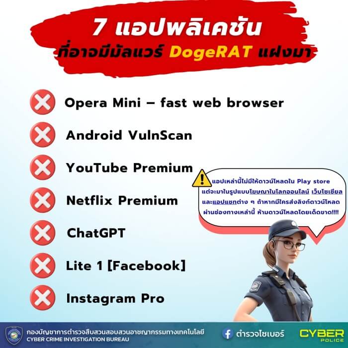7 แอปพลิเคชันที่มัลแวร์ DogeRAT มักนิยมฝังตัว 1.Opera Mini – fast web browser 2.Android VulnScan 3.Youtube Premium 4.Netflix Premium 5.ChatGPT 6.Lite 1 (Facebook) 7.Instagram Pro วิธีการป้องกันไม่ให้ถูกติดตั้งมัลแวร์ DogeRAT แบบไม่รู้ตัว คือ หลีกเลี่ยงการคลิกลิงก์หรือเปิดไฟล์จากแหล่งที่ไม่รู้จัก และอัปเดตเฟิร์มแวร์ให้เป็นเวอร์ชันล่าสุดอยู่เสมอ