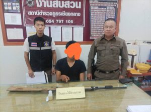 ได้ร่วมกันจับกุมตัว นายxxxxxxxxx อายุ ๔๑ ปี สัญชาติ ไทย หมายเลขประจำตัวประชาชน xxxxxxxxxx ที่อยู่ x หมู่ x ตำบลเชียงกลาง อำเภอเชียงกลาง จังหวัดน่าน ข้อหา “มีอาวุธปืนไว้ในความครอบครองโดยไม่ได้รับอนุญาตจากนายทะเบียนฯ,พาอาวุธปืนติดตัวไป ในเมือง หมู่บ้าน ทางสาธารณะโดยไม่ได้รับอนุญาตให้พาอาวุธปืนติดตัว, เสพสารเสพติดให้โทษประเภท ๑ (เมทแอมเฟตามีน) โดยผิดกฎหมาย”