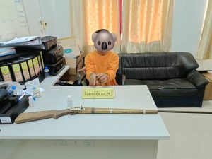 ๑.อาวุธปืนยาวแบบไทยประดิษฐ์ ขนาด .๒๒ LR ไม่มีหมายเลขทะเบียน จำนวน ๑ กระบอก พิงอยู่บริเวณฝาผนังบ้านในห้องแต่งตัวของนาย xxxxx ในบ้านหลังดังกล่าว