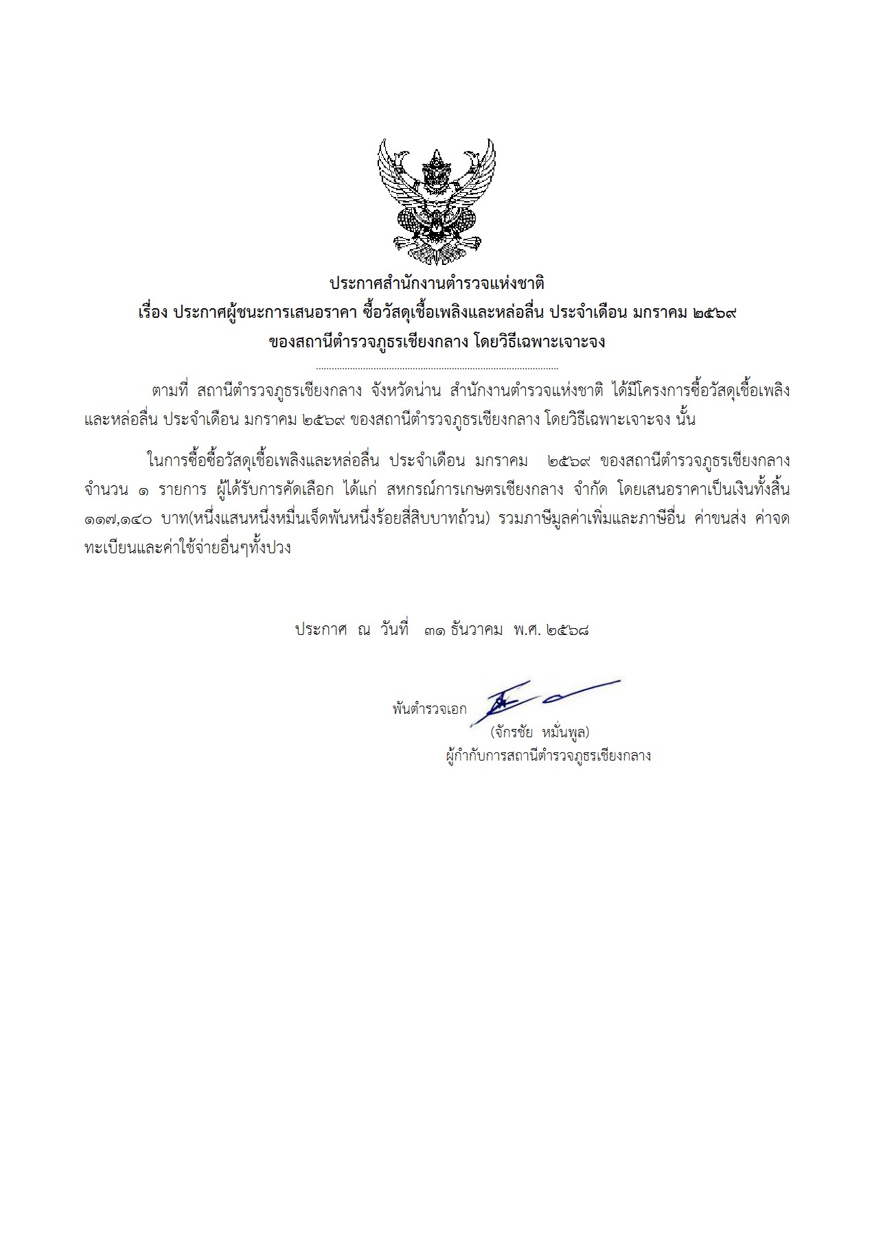 ประกาศ การจัดซื้อจัดจ้าง ประจำเดือน มกราคม 2569 ของ สภ.เชียงกลาง